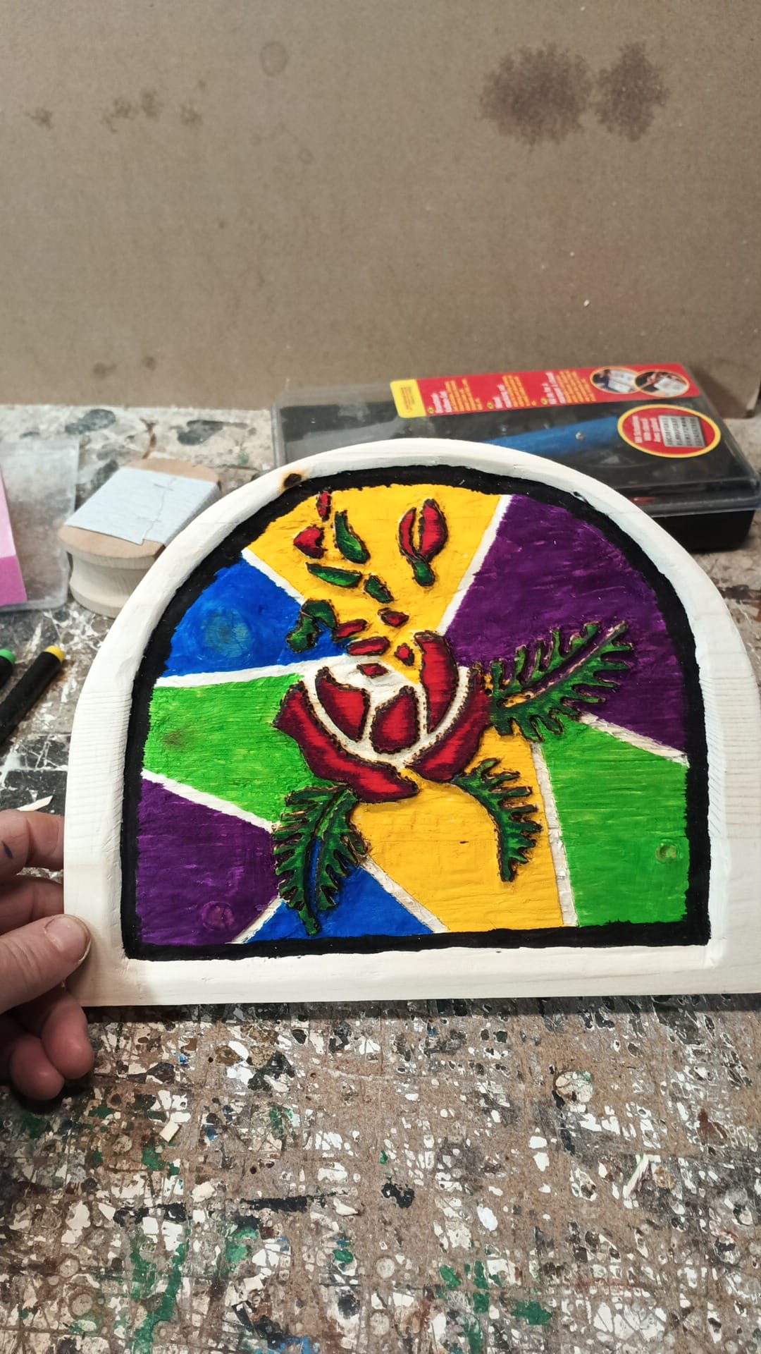 Ručně vyřezávaná dřevěná růže, která imituje kouzlo barevného skla. Každý detail je pečlivě vypracovaný a doplněný jemnými barvami, které připomínají vitráže. Stylová dekorace, která vnese do interiéru luxus, eleganci a jemnou hru světla.
